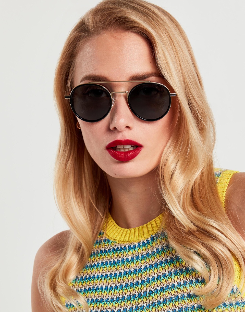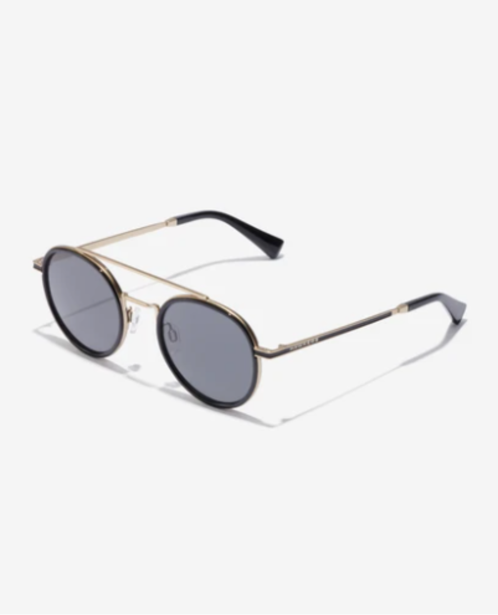 La estructura met谩lica dorada de este modelo redondo se complementa con lentes oscuras, marcos internos y terminales de TR90 en negro brillante. La hendidura negra a lo largo de las patillas y la barra superior refuerza su look sofisticado y actual.