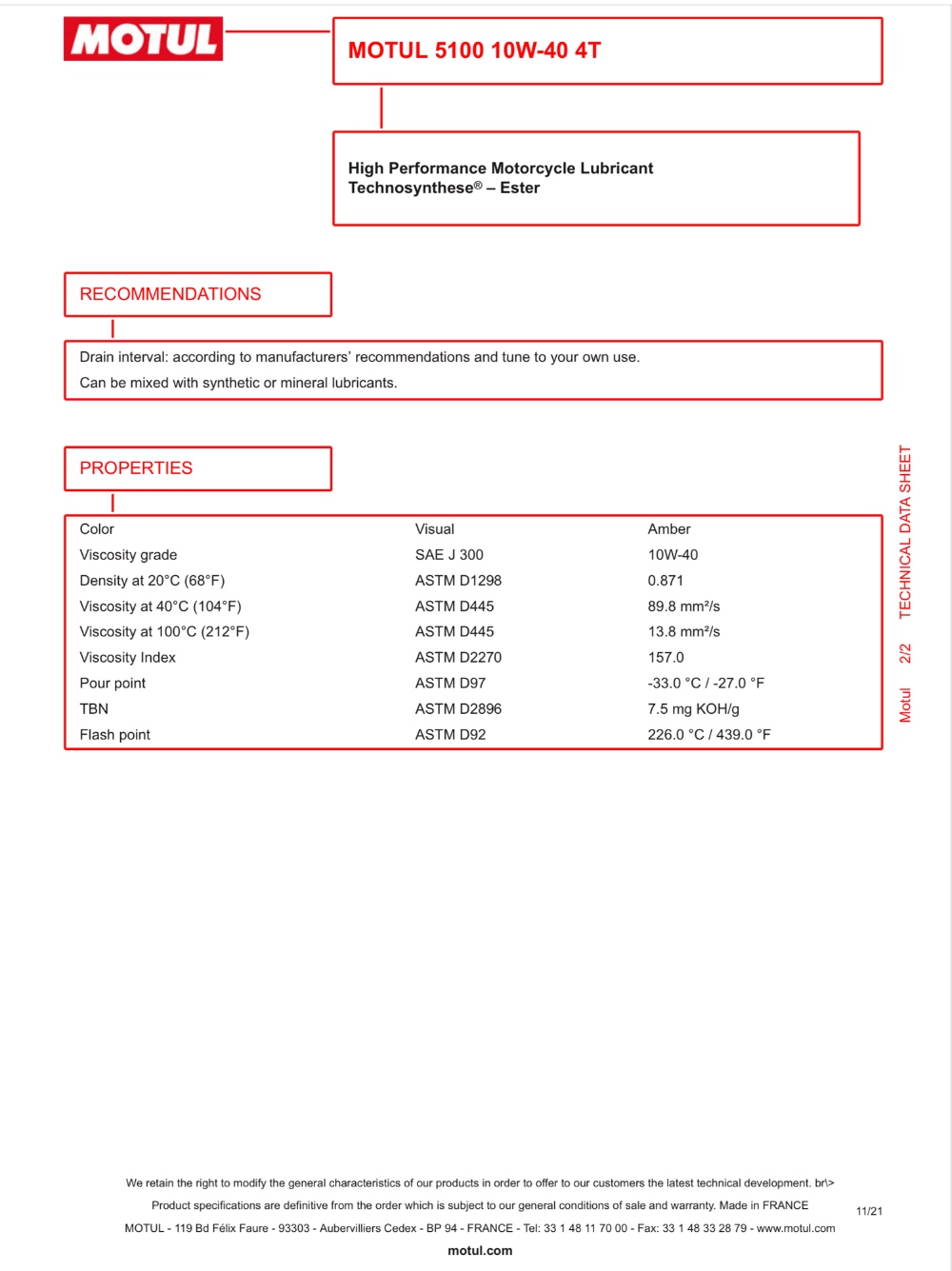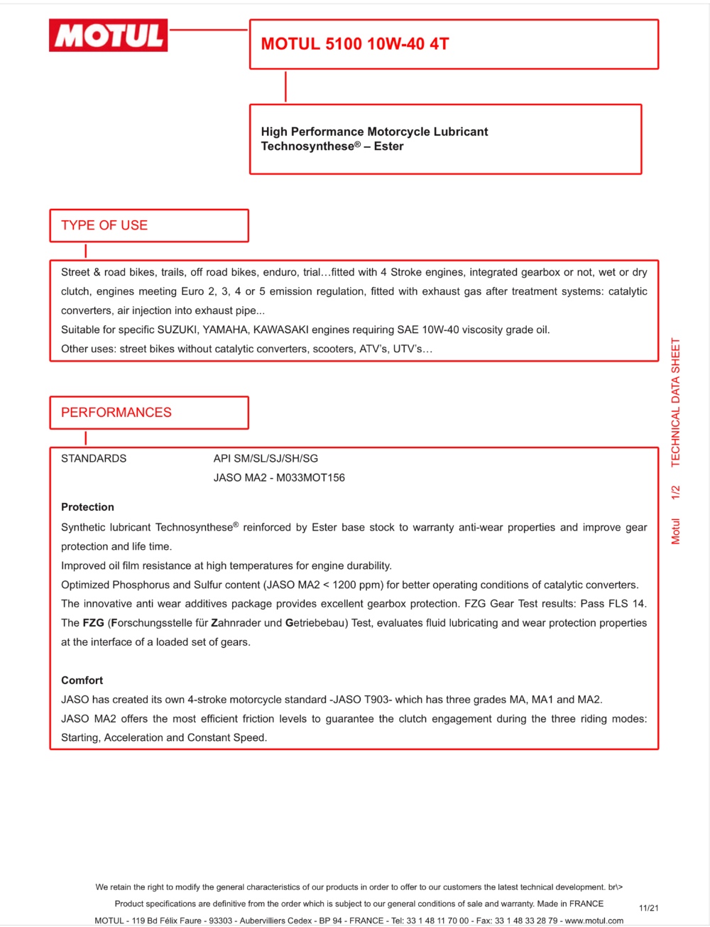 Suitable for specific SUZUKI, YAMAHA, KAWASAKI engines requiring SAE 10W-40 viscosity grade oil.