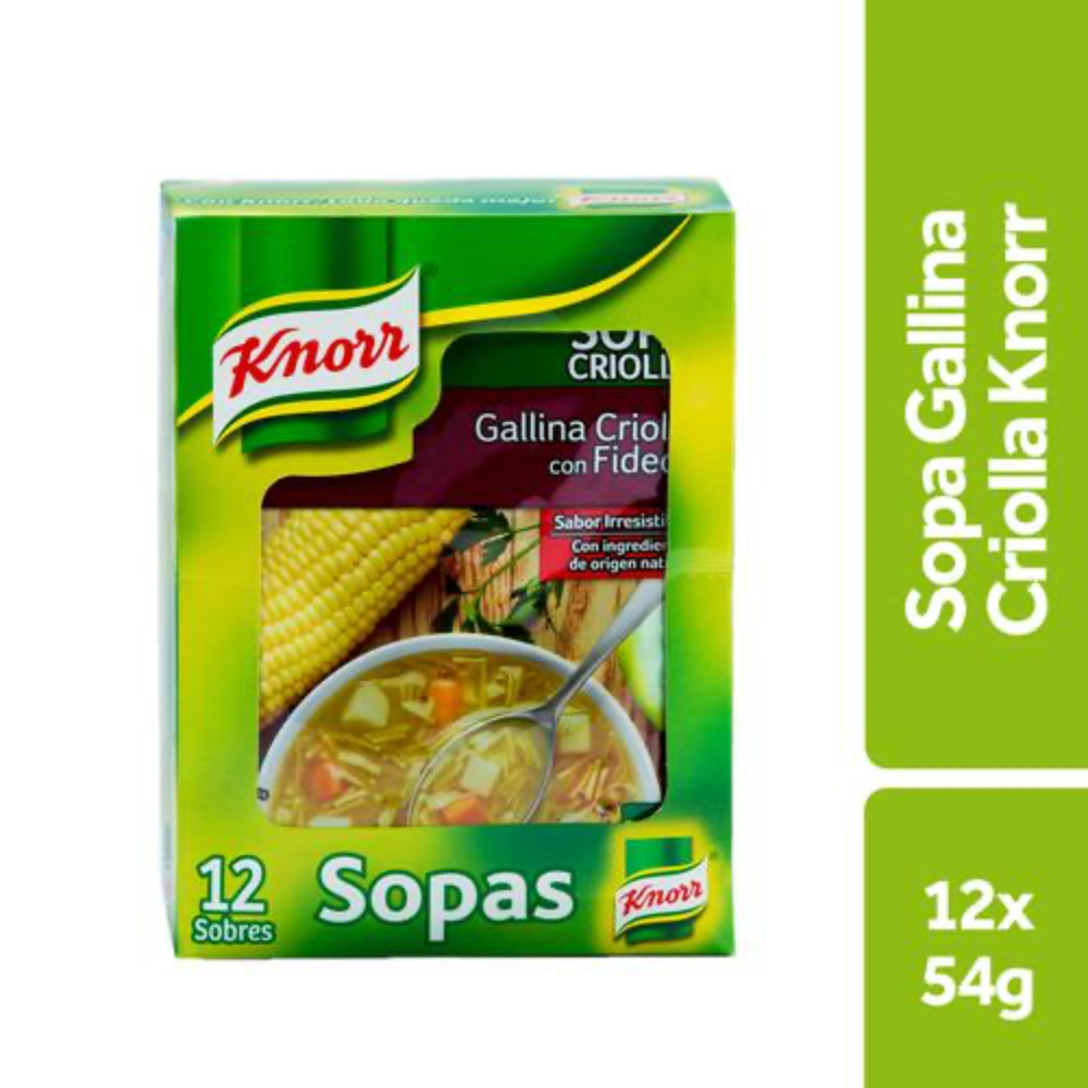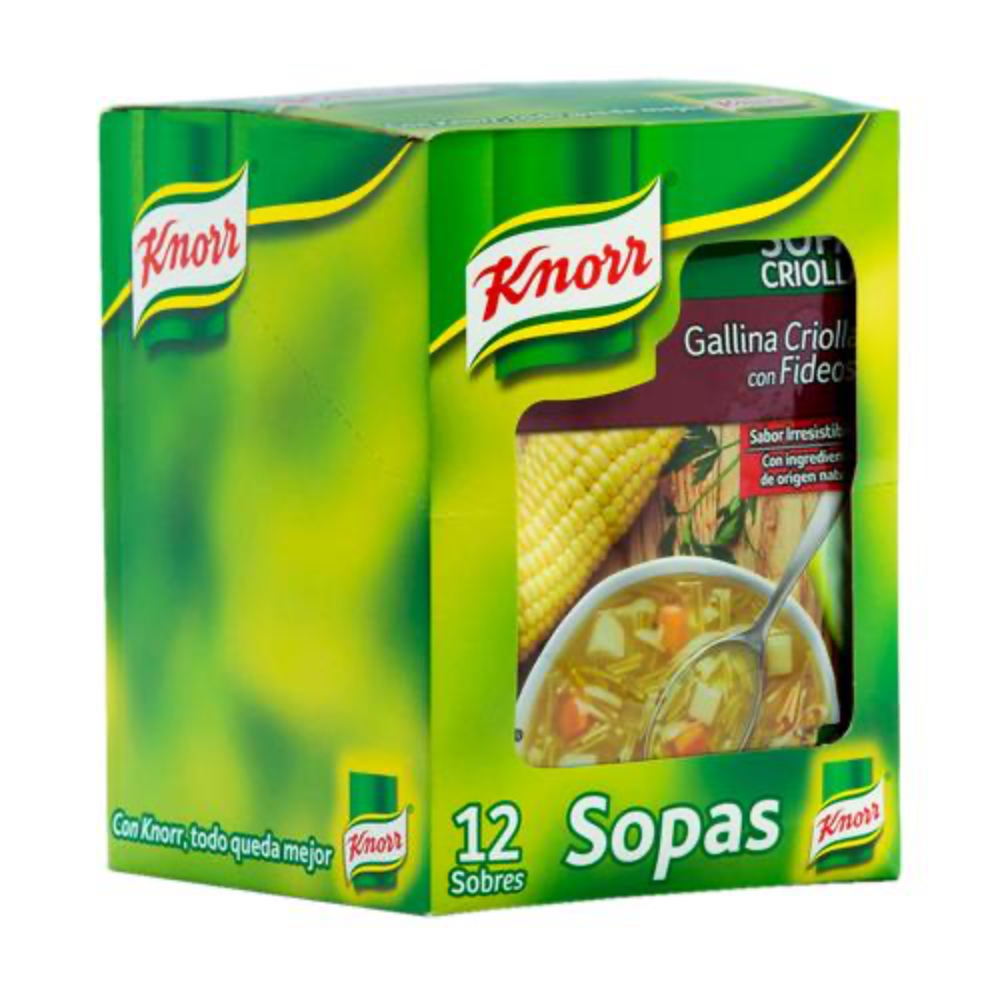 Sopa de Gallina Criolla con la perfecta combinación de ingredientes de origen natural: cebolla, zanahoria, chile dulce, puerro y fideos. Pack compuesto por 12 sobres de sopas de Gallina Criolla con Fideos en una plegadiza display de cartón.