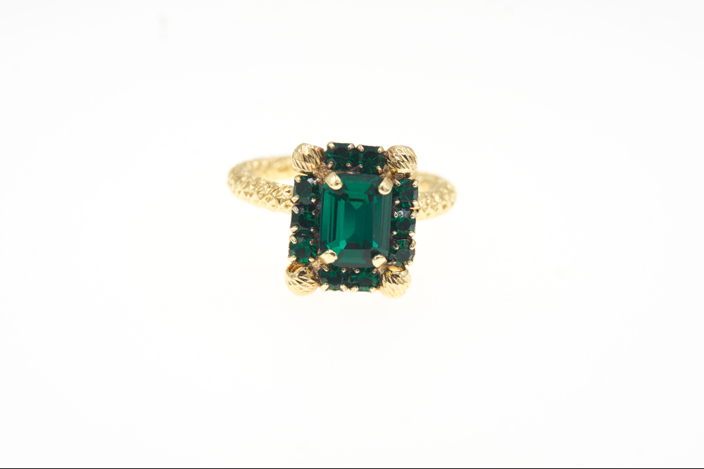 Cristal verde octogonal rodeado de pequeñas esferas doradas en las esquinas y pequeños cristales verdes en los laterales