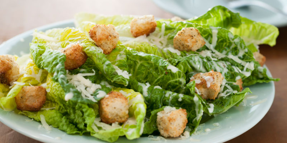 Ensalada de lechuga romana, croutones de la casa, parmesano rallado y aderezo cesar.