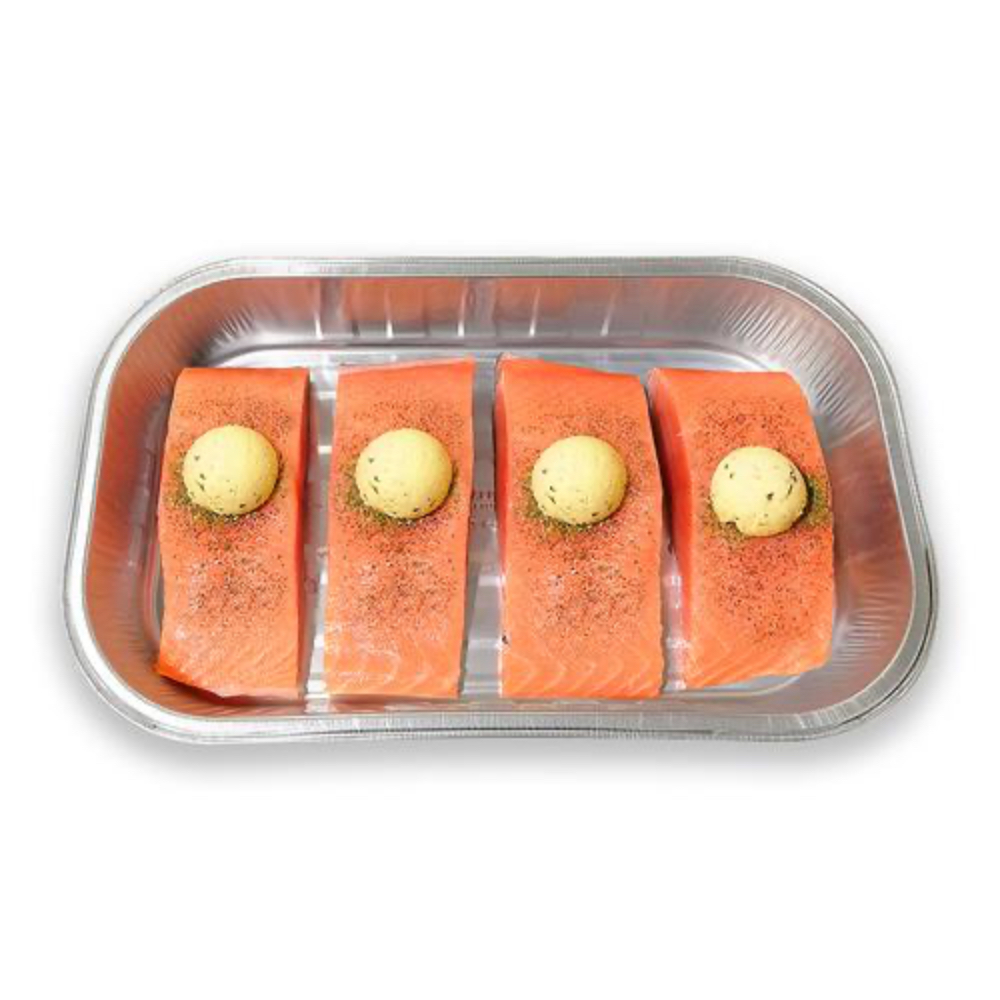 Listo para hornear. Contiene: Salmón, Spread de Ajo y Condimentos.
