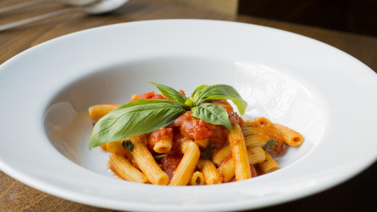 Pasta acompañada con salsa de pomodoro e basilico.